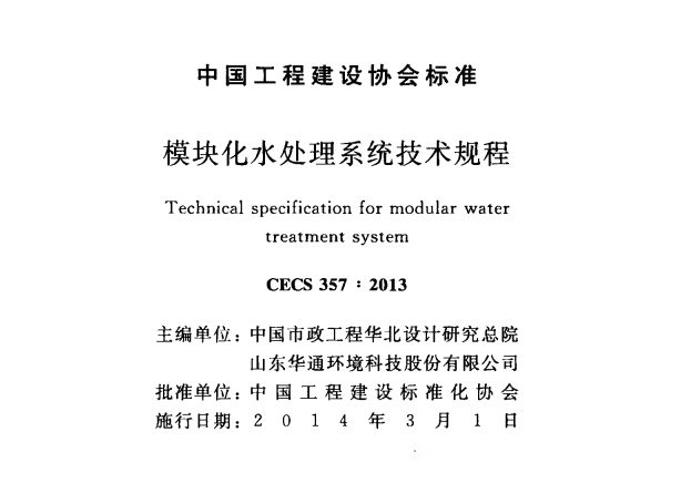CECS357-2013 模块化水处理系统技术规程